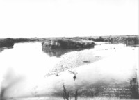 GB 086 "View of Low Line Canal Just Above Perrine Coulee; September 11, 1912;" wide view of water in canal, with gates; trees and buildings in background.