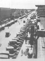 GB 092 A view of busy Main Ave, looking southeast and taken from the top of the Twin Falls Bank and Trust building. Automobiles line the street and several people are on the sidewalks. Business and buildings visible include: Rogerson Hotel; the Golden Rule; American Electric Co.; Marketeria Cash and Carry Grocery; Idaho Department Store, Twin Falls Hardware, Booth Mercantile; Diamond Hardware; L. Rasmussen Jewelry; Candy