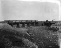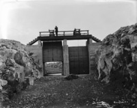 S 005 A man (possibly Bisbee) stands in a dry canal bed among several gates from a reservoir. Bisbee's photograph box in the foreground.
