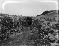 S 001 A man stands in the tunnel entrance of a dug out rock section of a canal.