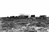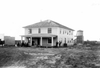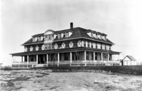 GB 059 "The Hotel at Amsterdam;" square wooden frame building, with several people posing near porch in the front. Outbuildings in background.