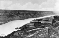 GB 063 Perrine's Blue Lakes farm and orchard taken from a hand-colored postcard based on an original Bisbee photo (522), looking west along the north side of the Snake River Canyon. Telephone poles and the Perrine Coulee visible.