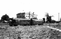 GB 051 The Twin Falls Electric Railway (Railroad) cars parked behind the Court House. Several people pose leaning out the windows.