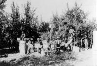 GB 062 "Idaho Fruit;" several men stand among boxed fruit in an orchard. {Blurry copy of 2126.}