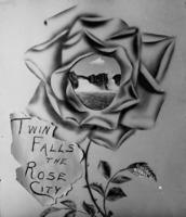 PC-2298 "Twin Falls ; The Rose City;" photo of the Twin Falls waterfall in the center of a painted rose. -