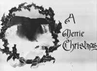 PC-2279 A Merrie Christmas; design made by Clarence Bisbee for his Christmas cards with the Twin Falls waterfall in the center. -