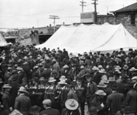 PC-2100 "Land Drawing, Twin Falls, Idaho;" a large crowd of mostly men stand in front of a canvas tent erected in an alley behind a brick building. -
