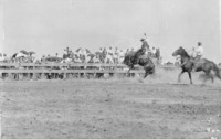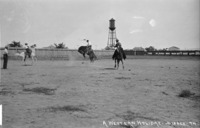 PC-2097 "Fun for the Cowboys;" cowboys exhibiting horse at the Twin Falls Athletic Field; two men on horseback, one holds a rope tied to a bull, three others stand among them, one with a saddle. Several spectators stand beside or sit on the fence in the background. Water tower and several houses in background. -