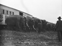 PC-2319 "When the Circus Comes to Town;" several elephants stand on th ground in front of the circus train. -