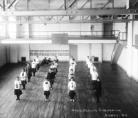 GB 019 "High School Gymnasium;" Twin Falls High School students in formation on the gymnasium floor, a couple sit on the floor in the back; staircase and mezzanine can be seen; basketball hoop and weights also visible -