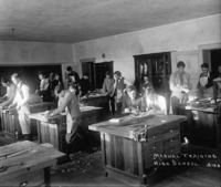 PC-2309 "Manual Training. High School;" students working with saws, other carpentry tools in Twin Falls High School classroom. -