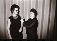 KEL 698 Two winners of the Luther Hulsey Gulick award for outstanding leadership in the Twin Falls Camp Fire Girls Council, Mrs. Frank Depew, left, and Mrs. Orval Johnson, admire the pins presented to them at the council's annual dinner meeting at the Holiday Inn.
