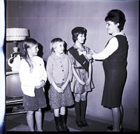 KEL 712 Among the girls in the Junior Girl Scout Troop No. 498 receiving pins for the first time and participating in the re-dedication ceremony are, from left to right, Cathy Musser, Deborah Mills, and Diane Bennett. Mrs. Mary Bennett, leader of the group, pins the award pins onto the girls' dresses. Behind the girls is a television set with a potted plant and a lamp on top of it.