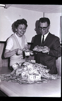 KEL 702 Mrs. Merle Stoddard and Rudy Williamson stand beside a pile of one dollar bills on top of a table during the Country Music Jamboree appreciation dinner held at the Twin Falls Moose Hall. $1,342.59 was earned by the jamboree which went to the Twin Falls Easter Seal Center.