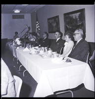 KEL 709 Several men and women are seated behind a long table watching the fashion show at the Filer Kiwanis Club Ladies' Night held at the Twin Falls Holiday Inn. The men are wearing suits and ties and the woman are wearing dresses and corsages. The table is covered in a white tablecloth, and on top of the table are glasses, napkins, a bowl, some baskets of bread, and a pot of flowers. A microphone stands in front of the table. In the corner of the room stands an American flag. Two landscape paintings hang on the back wall.