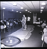 KEL 708 A woman models a patterned sleeveless dress at a fashion show during the Filer Kiwanis Club Ladies' Night held at the Twin Falls Holiday Inn. She walks down a runway with a fountain at the end. Several people sit in chairs at the side of the room, watching. At the back of the room is a table covered in a white tablecloth with a bouquet of flowers on top, and Mrs. Morris Carlson, the narrator of the event, stands behind it.