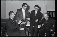 KEL 701 Four men dressed in suits and ties gather in a meeting room at the Country Music Jamboree appreciation dinner held at the Twin Falls Moose Hall. Two are seated in folding chairs, one is seated on the edge of a table, and the other is standing as they visit. A chair and a stand are against the side wall.
