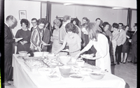 KEL 704 A large group of people stand in line for a potluck dinner at the Country Music Jamboree appreciation dinner held at the Twin Falls Moose Hall. On the table are an assortment of bowls of salads, a pan of meat, and a tray of dinner rolls. In the background behind the line of hungry people is a coat wrack and a picture of the American flag hanging on the back wall.