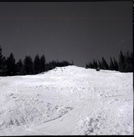 KEL 619 An aerial photograph shows the snow covered slopes at Sun Valley where the American International Team skiing races were held. A road winds around the side of a slope, and pine trees cover the landscape.