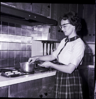 KEL 617 Times-News recipe winner Mrs. Marvin Strope stands behind a stove in a kitchen, stirring a pot on one of the burners, preparing her winning Congo Bars. She is dressed in a plaid skirt and matching top. Cupboards line the kitchen walls. A set of cooking utensils hang on a wall and some containers sit in the corner on the counter.