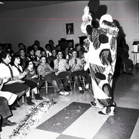KEL 611 Tony Laughton, brother of late actor Charles Laughton, performs a benefit show sponsored by the Twin Falls Jaycees at Robert Stuart Junior High for students of the special education class. He is dressed as a clown, and stands in front of an audience of young children sitting on chairs and clapping their hands. A television is pressed against the side wall, and a framed image of President George Washington hangs on the wall above it.