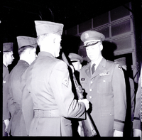 KEL 610 Conducting inspection of the local unit of the U. S. Army Reserve is Maj. Glenn E. Greer, representative of the Inspector General's office, X Corps headquarters at Ft. Lawton, Washington. The men are dressed in their military uniforms and standing at attention. The man in the foreground is holding a gun as the Inspector General looks him over.