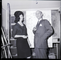 KEL 532 Art Guild of the Magic Valley president Mrs. Juanita Miller and artist Olaf Moller discuss Mr. Moller's upcoming art show at his gallery in Rupert. Mrs. Miller is dressed in a blouse and skirt and Mr. Moller is dressed in a suit and tie. Behind them is a proportion chart for drawing the human figure. An easel is to the side. Several paintings are propped up on the window sill in the back of the room.
