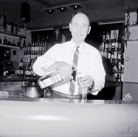 KEL 525 Fergus Kilmartin stands behind a bar and pours a dram of Irish whiskey for a friend at the Perrine Hotel Lounge prior to his departure to his Irish homeland to resume his family's century-old profession of floristry. On the shelves and counters behind him are several bottles of different liquors.