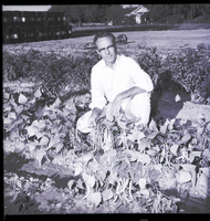 KEL 522 Dr. Leslie Dean, Twin Falls extention plant pathologist for the University of Idaho, kneels in a field beside the new disease-resistant bush beans that he developed. Dr. Dean crossed Idaho Bountiful snap beans with Pinto U.I 111, and Great Northern U.I. 31 and other bean types in the hopes of producing an