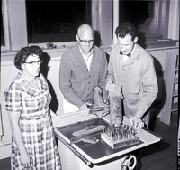 KEL 530 Items and tools used for woodworking and leathercraft are displayed by Mrs. R. O. Jacky and Walter Olson, two enrollees in a Twin Falls Recreation Department-sponsored adult leathercraft and woodworking class. Ray Beaumont, instructor of the course, admires the items. Mrs. Jacky is dressed in a plaid dress, Mr. Olson wears a button-up sweater, and Mr. Beaumont wears a bow tie and work coveralls. On the table is a saw, knives, a leather wallet, a wooden ornament, and a log with the image of an elk carved into it.