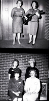 KEL 515 In the top image, Mrs. Charlotte Crockett and Mrs. William Kinsey provide musical entertainment at a luncheon meeting for the newly organized Twin Falls Cowbelles held at the Depot Grill. Mrs. Crockett is wearing a dress, and Mrs. Kinsey is wearing a top and skirt and is holding a guitar. In the bottom image, standing from left to right are Mrs. Larry Lickley, president-elect of the local Cowbelles group, and Mrs. Cecil Brim, courtesy chairman. Seated from left to right are Mrs. Harry Eaton and Mrs. Ralph Olmstead, secretary-treasurer of the local unit. They are wearing blouses and skirts and two of the women are wearing hats. A print of a cubist painting rests against the wall behind them.