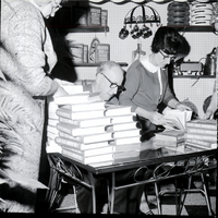 KEL 503 Vardis Fisher signs copies of his book "Mountain Man" at Sallie's Gifts & Books in Twin Falls. He is seated at a table covered in stacks of the book. Two women stand by the table, looking at the books. On the shelves behind him are copies of the book and various antiques and gift items.