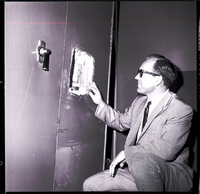 KEL 513 Grant Ousterhout, general manager of Reliance Credit Corp, looks at a hole in a safe door. When employees of the firm couldn't open the safe to get some files by using the combination, and after two locksmiths failed to open it, a power chisel was used. With the help of J. C. Boster, Boster Key Shop, the combination of the safe was cut out with the power chisel. Mr. Ousterhout is dressed in a suit and tie.