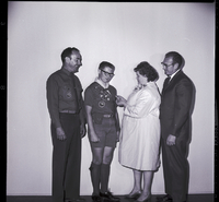 KEL 281 Donald Anderson, scoutmaster of troop 79, awards Boy Scout Ned Leavitt with his Eagle Scout badge during a court of honor at the Twin Falls LDS Eighth Ward Chapel. Mr. and Mrs. Jack Leavitt watch. Donald Anderson is dressed in his Boy Scouts adviser uniform, with a patch embroidered on his front pocket reading "Bradley 2 Snake River Council." Ned Leavitt is dressed in his uniform, with a sash covered in badges and a patch embroidered on his front pocket reading "Snake River Area Council Idaho-Utah-Nevada." Mrs. Jack Leavitt, wearing a dress and corsage, examines the Eagle Scout award. Jack Leavitt stands beside her, wearing a suit and tie.