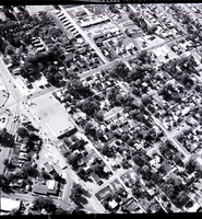 KEL 290 An aerial photograph of the west five points intersection in Twin Falls, Idaho, shows Albertsons grocery store on the corner of Addison Ave. and Washington St. Across the street is the hexagon-shaped building of West Five Point Cleaners. Various trees, buildings, houses, streets, roads, and automobiles (cars) are visible in the aerial view.