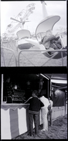KEL 285 In the top image, two little boys sit inside the car of a carnival ride at the Twin Falls County Fair. Other carnival rides are seen in the background. In the bottom image, a group of boys stand outside a Midway booth. A man and a woman are inside the booth, giving directions. One boy is holding a gun, ready to shoot for prizes. Inside the booth is a wall of boxes of Crackerjacks, and stuffed animals hang from the ceiling.