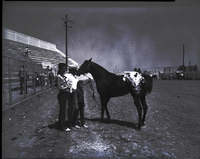 KEL 228 Frank Harney, dressed in a cowboy hat, holds the reigns of Boomer Britches, the grand champion stallion at the Idaho-Oregon-Nevada Appaloosa Horse Show. The horse is owned by Robert Harney of Twin Falls. A woman and young boy stand beside him. A group of people walk to the side of the corral, next to some bleachers. Some other horses and owners are in the background.
