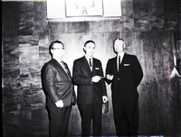 KEL 229 From left to right, Chet Stahl, chairman of the hospital board, DeLoy Giles, patient of the Elks Rehabilitation Center, and Weldon Haskins, Elks state president, stand in front of a display for the Idaho Elks Rehabilitation Center at a BPOE convention held in Twin Falls. The men are dressed in suits and ties, and Mr. Giles holds a cane. Mr. Giles, who lived at the Elks Rehabilitation Center in Boise on and off for fifteen years after being almost completely paralyzed in a logging accident when he