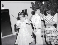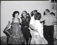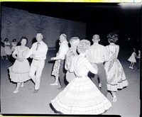 KEL 108 Four men and four women in full skirts square dance outside together prior to the Idaho State Square Dance Festival. The name tag of the woman on the left reads "Corrine Thiebery."