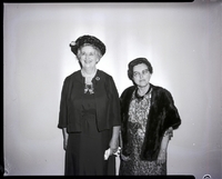 KEL 100 Two women attend the Idaho Federation of Women's Club Convention. The woman on the left is dressed in a dress, jacket, bonnet hat, and is holding a pair of gloves. The woman on the right is dressed in a dress and fur shawl.
