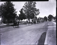 KEL 103 A procession of women on horses, dressed in cowboy hats and boots, ride down a street in the Magic Valley Western Horse Show Parade. Another group of women ride down 5th St. W. Some houses, automobiles (cars), and a truck carrying a car are in the background. Several trees line the street.