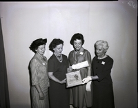 KEL 099 From left to right, Mrs. Robert Long, Mrs. S. Merrill, Mrs. Victor Fletcher, and Mrs. Rex Harris receive an education award from the Shell Oil Company at a state meeting of the Idaho Federation of Women's Clubs convention held in Twin Falls. The four women hold a framed certificate reading "General Federation of Women's Clubs Shell Oil Company Education Program 1964 Award of Achievement, Idaho Falls Women's Club, Idaho Falls, Idaho, For its outstanding program of helping young people in its community to further their education." Mrs. Fletcher holds a $500 check.