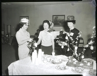 KEL 074 Serving coffee at the South Central District Home Demonstration Council get-acquainted coffee hour is Mrs. Wesley Sonius, left, member of the Merry Marrieds Club, to Mrs. Robert Moldenhauer, center, president of Town and Country Club, and Mrs. Loren Anderson, secretary and treasurer of the Town and Country Club. The Merry Marrieds club members and Homebuilders club members were hostesses for the coffee hour. The three women are wearing dresses, and Mrs. Sonius and Mrs. Anderson are wearing hats. The table has a small flowering tree decoration and plates of cookies, cups, and napkins. Some people can be seen seated in folding chairs below a painting hanging on the wall in the background.