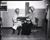 KEL 076 Mrs. Wilbur Shook and Nat Spofford sit on folding chairs looking at a scrapbook on display at a Horseless Carriage Club tour and old-time fashion show. Mrs. Shook is dressed in a skirt, shawl, and bonnet, and Mr. Spofford is dressed in a long coat and beret hat. The front of the photo album reads "Post."