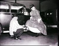 KEL 082 Ben R. Box fixes his wife's high-buttoned shoe next to an old car at a Horseless Carriage Club tour and old-time fashion show. Mrs. Box is wearing a dress, petty coat, and bonnet, and Mr. Box is wearing a striped shirt, slacks, and a bowler hat. Another car is seen in the background.