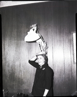 KEL 045 Winner of the most original hat at the Welcome Wagon Newcomers Club luncheon meeting was Mrs. James Spafford. The hat is covered in capsule and tablet medications of various sizes. Some pill boxes also decorate the hat. Mrs. Spafford is wearing a dress suit, and standing beside a table that has some ashtrays and a purse on it.