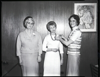 KEL 043 Luncheon chairman Mrs. R. W. Haines, right, pins a name tag on Mrs. Dennis Johnson, a first timer at the Welcome Wagon Newcomers Club luncheon. Another first timer, Mrs. Ralph L. Pleistick, stands to the left. A table with an ashtray on it and a chair are visible in the background. Behind the women on the wall is a painting of a clown.