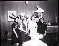 KEL 049 A group of original hat creations are modeled at the Welcome Wagon Newcomers Club April Fool's Day luncheon meeting held in the Depot Grill Caboose room. From left to right are Mrs. Wayne Robinson, Mrs. J. A. Milrany, Mrs. Phillip Whiting, and Mrs. Ed Goldade. Mrs. Robinson is wearing a black dress with a floral design on the top, and a hat with some bunny ears on it. Mrs. Milrany is wearing a plaid dress with a sailor style collar and a hat covered in balls of yarn and knitting needles. Mrs. Whiting is wearing a white dress and a hat with a clown resting under a paper umbrella on it. Mrs. Goldade is wearing a black shirt and plaid skirt and a hat of a crane figurine, holding a wrapped baby blanket in its mouth. The blanket reads "Destination Goldades." Several curled ribbons decorate the crane's head and tail. Some chairs and a grill with a counter top holding some salt shakers are in the background. A painting of a clown and a poster for smorgasbord hours hang on the wall behind them.