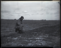 KEL 050 Charles Harris, president of the Twin Falls County Farm Bureau, inspects a wet field. Mr. Harris, who farms about four miles south of Twin Falls, is being hampered from plowing by cold, wet weather. He is dressed in a hat and coat.