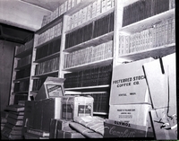 KEL 042 A storage room in the Twin Falls county court house is crowded with bookshelves filled with books, piles of books on the floor, and stacks of boxes filled with records. The microfilming of records with the new microfilm camera will save space in the office and enable the courthouse to keep more accurate and secure records.